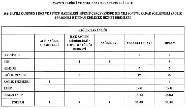 1 diyetisyen, 9 ebe, 2 hemşire, 25 sağlık memuru, 1 sağlık teknikeri, 3 bin 498 tabip, 32 bin 464 de uzman tabip istihdam edilecek.