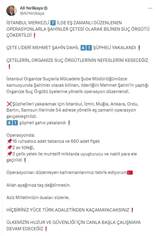 İçişleri Bakanı Ali Yerlikaya sosyal medya hesabından yaptığı paylaşımda "İstanbul merkezli 7 ilde eş zamanlı düzenlenen operasyonlarla Şahinler Çetesi olarak bilinen suç örgütü çökertildi. Çete lideri Mehmet Şahin dahil 41 şüpheli yakalandı. Çetelerin, organize suç örgütlerinin nefeslerini keseceğiz" ifadelerini kullandı.