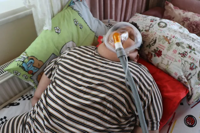 5 yaşında 90 kiloya ulaşan Yağız, fazla kilosu nedeniyle sağlık sorunları yaşamaya başladı. Küçük çocuk, geceleri solunum cihazına bağlı olarak uyuyabiliyor.
