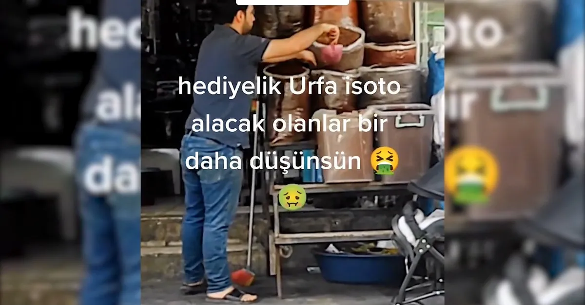 Şanlıurfa yöresine özgü 'isot' adıyla bilinen acı pul biberi satışı yapan bir esnaf, iddiaya göre yere dökülen biberleri fırçayla süpürerek yeniden tezgaha koydu.