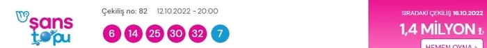 Milli Piyango Online ile Sisal Şans ortaklığında her hafta Çarşamba ve Pazar günleri yapılan MP TV canlı yayınında "Şans Topu sonuçları" belirlenerek şans oyunu severlere duyuruluyor. 6 şanslı numarayı doğru tahmin edenlerin büyük ikramiye sahibi olduğu oyunu Milli Piyango Online ve MPİ bayileri üzerinden oynayanlar Şans Topu Sonuçları sorgulama yapmak amacıyla "12 Ekim Şans Topu sonuçları açıklandı mı?" sorusuna yanıt arıyor.
