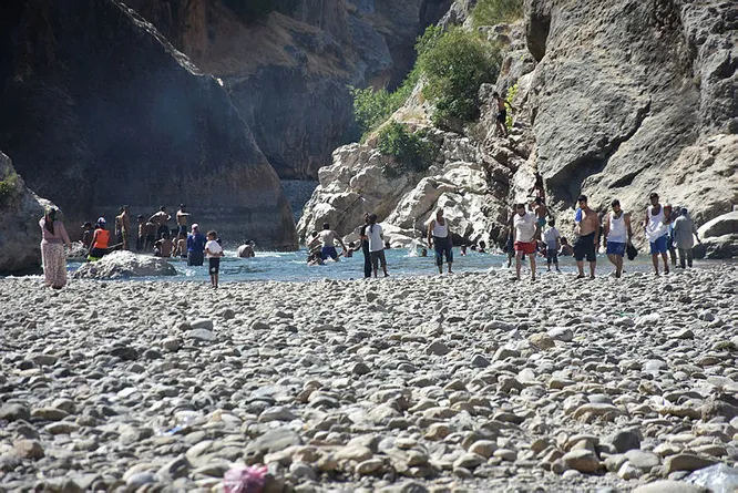 Kimi ziyaretçiler yüzerek serinlerken, kimileri ise ayaklarını suya sokuyor. Bölgede piknik yapan ve fotoğraf çeken turistler, eğlenceli zaman geçiriyor.