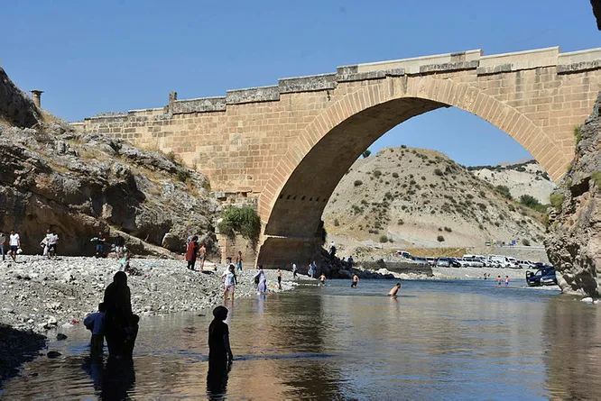 Bölgeyi yaz aylarında ziyaret eden turistler, serinlemek için 1800 yıllık Cendere Köprüsü altından akan Kahta Çayı'nda mola veriyor.