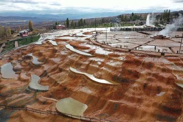 Sivas'ta, Pamukkale'ye benzerliğiyle dikkat çeken ve sudaki kükürdün oluşturduğu sarı tortular nedeniyle Altınkale adı verilen Sıcak Çermik Termal Bölgesi'ndeki termal tesis düzenlenen törenle hizmete açıldı.