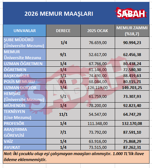 Memurlar, yılda iki kez toplu sözleşme zammı ve enflasyon farkı doğrultusunda maaş zammı alıyor. 2026 yılının ilk yarısı için belirlenen toplu sözleşme zammı yüzde 11 olarak belirlendi. Bu doğrultuda, kümülatif zam oranı yüzde 17,57'ye ulaştı. Bu zamma ek olarak, 1.000 TL'lik taban aylık artışı da uygulanacak.