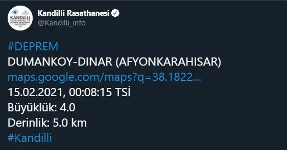 Boğaziçi Üniversitesi Kandilli Rasathanesi ve Afet ve Acil Durum Yönetimi Başkanlığı (AFAD)'ın sürekli olarak güncellediği ve kamuoyuna duyurdu son depremler listesine göre Afyonkarahisar Dinar'da saat 00.08'de 3.9 şiddetinde bir son dakika depremi meydana geldi. Yerin 5.39 kilometre derinliğinde meydana gelen deprem Burdur, Isparta ve Uşak illerimizde de hissedildi. Sarsıntıların ardından çevre il ve ilçelerde yaşayan vatandaşlar da panik yaşadı.