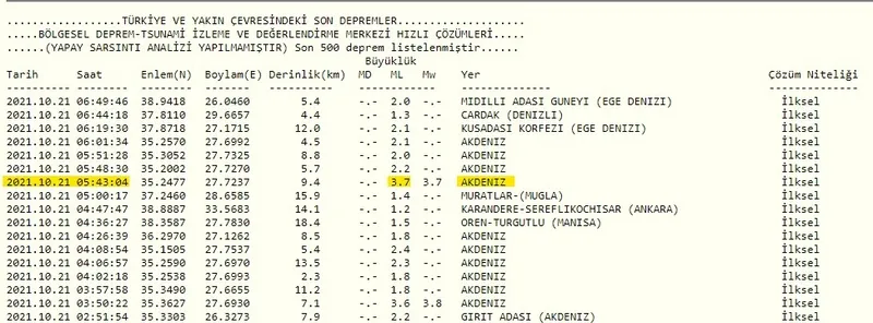 Boğaziçi Üniversitesi Kandilli Rasathanesi ve Afet ve Acil Durum Yönetimi Başkanlığı (AFAD)'ın sürekli olarak güncellediği ve kamuoyuna duyurdu son depremler listesine göre Akdeniz Girit Adası açıklarında saat 05.45'de 3.7 şiddetinde bir son dakika depremi meydana geldi. Yerin 10.34 kilometre derinliğinde meydana gelen deprem ülkemizde Muğla - Marmaris ve Antalya illerimizde de hissedildi. Sarsıntıların ardından çevre il ve ilçelerde yaşayan vatandaşlar da panik yaşadı.