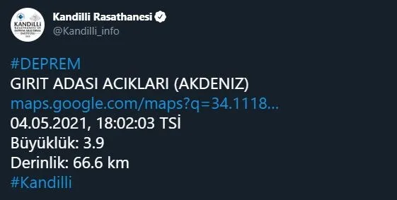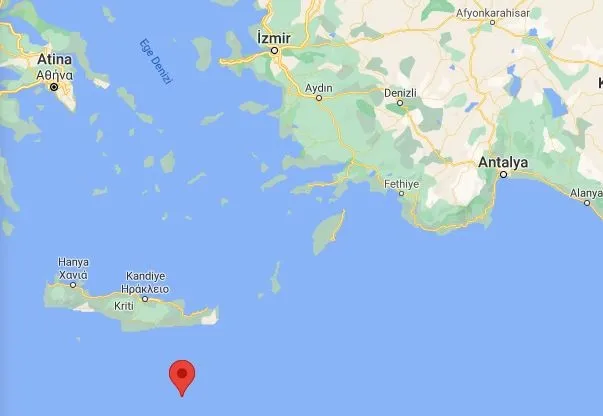 Boğaziçi Üniversitesi Kandilli Rasathanesi son depremler listesi verilerine göre Akdeniz - Girit Adası açıklarında saat 18:02'de yerin 66.9 kilomerter derinliğinde 3.9 şiddetinde deprem meydana geldi.