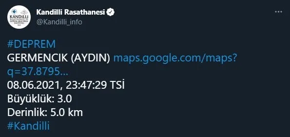 Boğaziçi Üniversitesi Kandilli Rasathanesi ve Afet ve Acil Durum Yönetimi Başkanlığı (AFAD)'ın sürekli olarak güncellediği ve kamuoyuna duyurdu son depremler listesine göre Aydın Germencik'te saat 23:47'de 3.0 şiddetinde bir son dakika depremi meydana geldi. Yerin 5.0 kilometre derinliğinde meydana gelen deprem İzmir, Manisa ve Muğla illerimizde de hissedildi. Sarsıntıların ardından çevre il ve ilçelerde yaşayan vatandaşlar da panik yaşadı.
