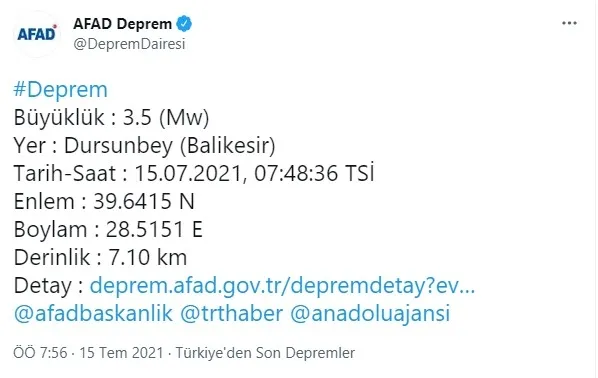 #Deprem Büyüklük : 3.5 (Mw) Yer : Dursunbey (Balikesir) Tarih-Saat : 15.07.2021, 07:48:36 TSİ Enlem : 39.6415 N Boylam : 28.5151 E Derinlik : 7.10 km
