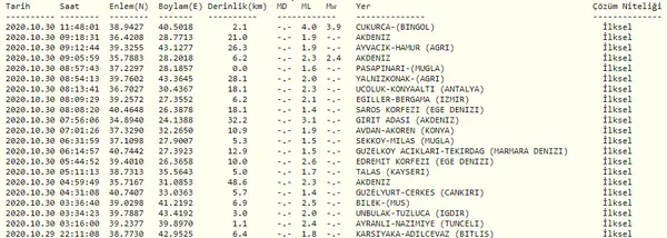 KANDİLLİ VE AFAD SON DEPREMLER LİSTESİ