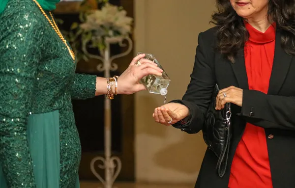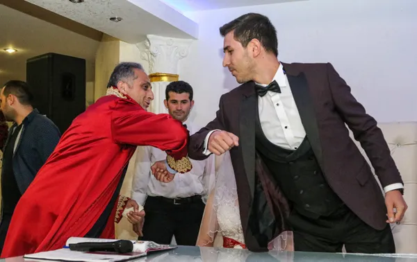 Antalya'da düzenlenen düğün töreninde, düğün sahipleri, kapıda karşıladıkları misafirlerine kolonya ikram ederek, salona davet etti. Düğün sahipleri, misafirlerle tokalaşmazken, nikah memuru ile damat ise tokalaşmak yerine dirseklerini birbirine vurdu.