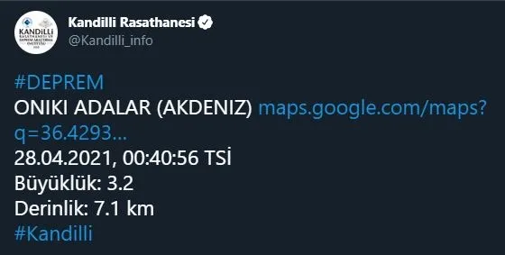 Boğaziçi Üniversitesi Kandilli Rasathanesi son depremler verilerine göre saat 00:40'da, yerin 7.1 kilometre derinliğinde Akdeniz Oniki adalar bölgesinde meydana gelen depremin şiddeti 3.5 olarak ölçüldü.