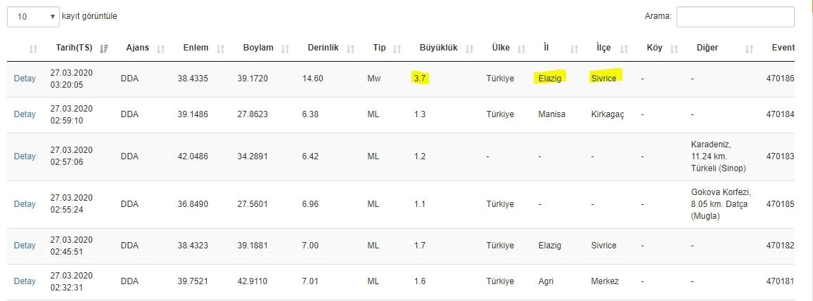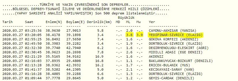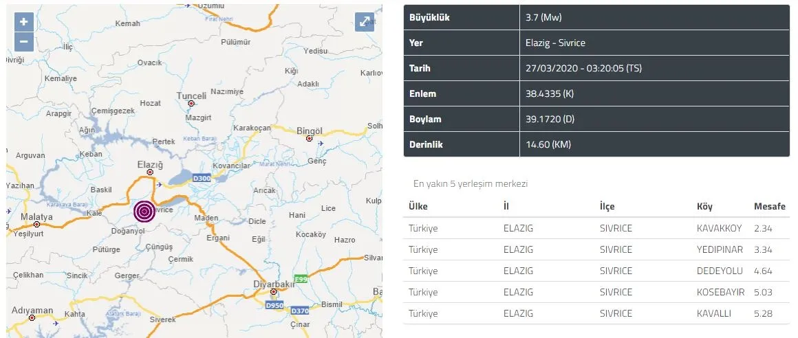 Boğaziçi Üniversitesi Kandilli Rasathanesi ile Afet ve Acil Durum Yönetimi Başkanlığı (AFAD)'ın sürekli olarak güncellediği ve kamuoyuna duyurduğu son depremler listesine göre Elazığ Sivrice'de saat 03.20'de 3.9 şiddetinde bir son dakika depremi meydana geldi. Sarsıntılar Malatya'da hissedilirken yerin 14.6 kilometre derinliğinde meydana gelen depremin ardından çevre il ve ilçelerde yaşayan vatandaşlar da panik yaşadı. İşte son dakika haberinin tüm ayrıntıları...