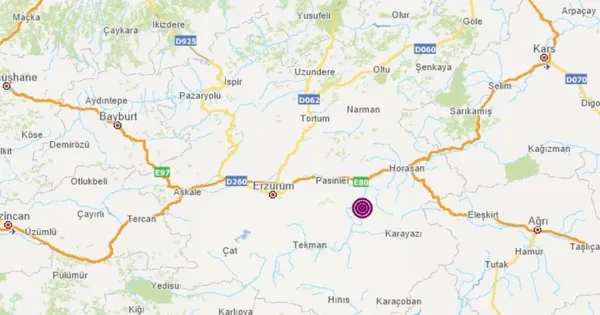 Son dakika deprem haberi... Erzurum'daki 5.1 büyüklüğündeki depremin 6,94 kilometre derinlikte meydana geldiği belirlendi. Deprem çevre illerden de hissedildi. Depremin merkezinden görüntüler gelmeye devam ediyor. Köprüköy ve Hınıs ilçeleri arasındaki karayolu sarsıntı sonrası heyelan nedeniyle kapandı.