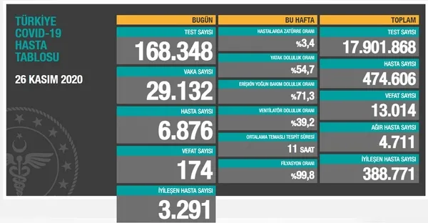 26 KASIM TÜRKİYE CORONA VİRÜS VAKA VE ÖLÜ SAYILARI