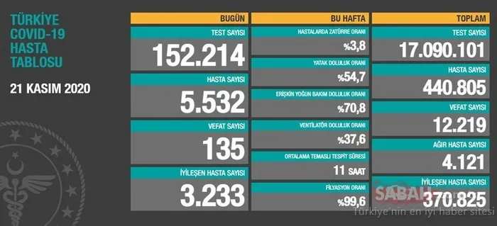21 KASIM TÜRKİYE CORONA VİRÜS VAKA VE ÖLÜ SAYILARI