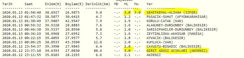 Boğaziçi Üniversitesi Kandilli Rasathanesi son depremler listesi verilerine göre Akdeniz Girit Adası açıklarında saat 23.37'de yerin 88.4 kilometre derinliğinde 3.0 şiddetinde deprem meydana geldi. Öte yandan saat 01.50'de İzmir Aliağa'da yerin 9 kilometre derinliğinde 3.0 şiddetinde bir deprem daha meydana geldi. Çevre bölgelerde bulunan vatandaşlar korku ve panik yaşadı...
