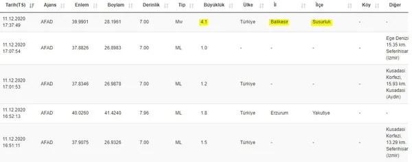 Deprem kuşağı sınırları içerisinde yer alan ülkemizde son dakika deprem olayları meydana geliyor. Afet ve Acil Durum Yönetimi Başkanlığı (AFAD)'ın sürekli olarak güncellediği ve kamuoyuna duyurdu son depremler listesine göre Balıkesir Susurluk'da saat 17.37'de 4.1 şiddetinde bir son dakika depremi meydana geldi. Yerin 7.00 kilometre derinliğinde meydana gelen deprem Çanakkale ve Bursa illerimizde de hissedildi. Sarsıntıların ardından çevre il ve ilçelerde yaşayan vatandaşlar da panik yaşadı. Boğaziçi Üniversitesi Kandilli Rasathanesi son depremler listesi verilerinde 4.1 şiddetindeki depremin merkez üssü olarak Bursa ili Mustafakemalpaşa ilçesi olarak belirtildi.