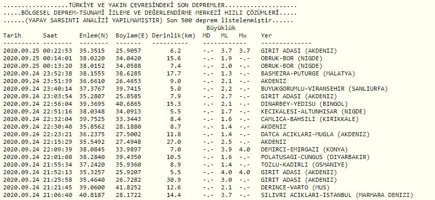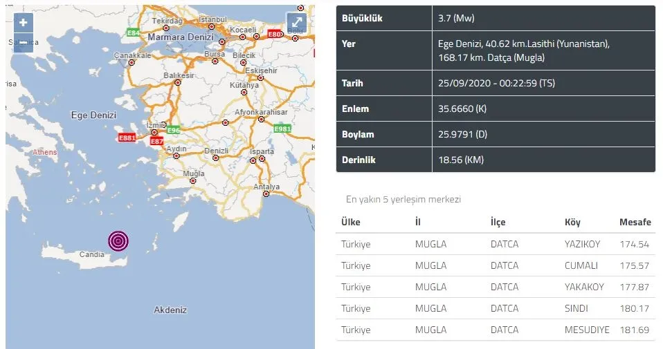 Boğaziçi Üniversitesi Kandilli Rasathanesi ve Afet ve Acil Durum Yönetimi Başkanlığı (AFAD) son depremler listesi verilerine göre Ege Denizi'nde saat 00.22 sularında 3.7 büyüklüğünde bir son dakika depremi meydana geldi. Derinliği 18.56 kilometre olarak ölçülen deprem Muğla ili Datça ilçesinde de hissedildi. Sarsıntılar sonrası merkez üssüne yakın bölgelerdeki yerleşim yerlerinde ikamet eden vatandaşlarımız kısa süreli panik yaşadı.