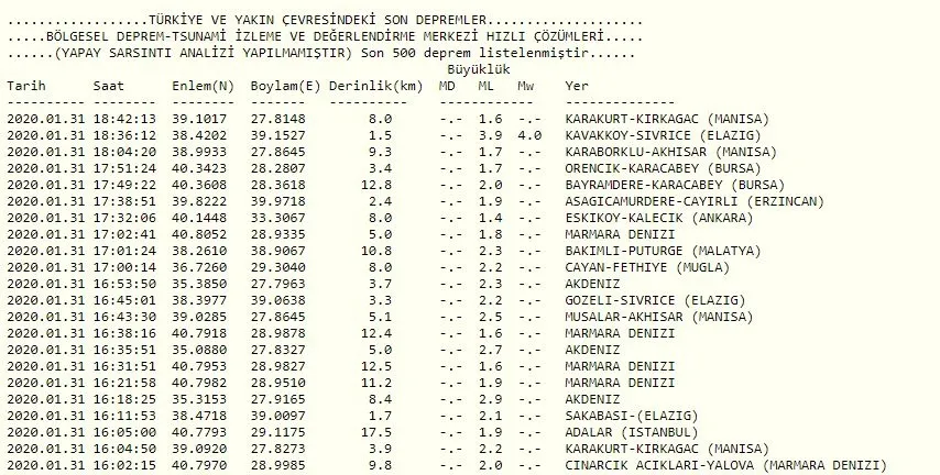 AFAD SON DEPREMLER LİSTESİ VERİLERİNE GÖRE ELAZIĞ DEPREMİ!