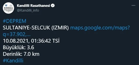 Boğaziçi Üniversitesi Kandilli Rasathanesi ve Afet ve Acil Durum Yönetimi Başkanlığı (AFAD)'ın sürekli olarak güncellediği ve kamuoyuna duyurdu son depremler listesine göre İzmir'de saat 01:36'da 3.6 şiddetinde bir son dakika depremi meydana geldi. Yerin 7.0 kilometre derinliğinde meydana gelen deprem çevre illerimizde de hissedildi. Sarsıntıların ardından çevre il ve ilçelerde yaşayan vatandaşlar da panik yaşadı. Son dakika deprem haberinin detayları…