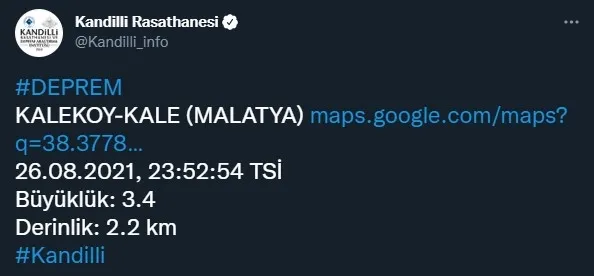Boğaziçi Üniversitesi Kandilli Rasathanesi ve Afet ve Acil Durum Yönetimi Başkanlığı (AFAD)'ın sürekli olarak güncellediği ve kamuoyuna duyurdu son depremler listesine göre Malatya'da saat 23:52'de 3.7 şiddetinde bir son dakika depremi meydana geldi. Yerin 11.18 kilometre derinliğinde meydana gelen deprem Elazığ, Adıyaman ve Diyarbakır illerimizde de hissedildi. Sarsıntıların ardından çevre il ve ilçelerde yaşayan vatandaşlar da panik yaşadı.