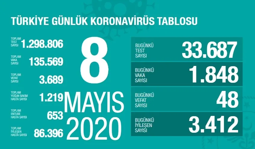 Türkiye'de son 24 saatte bin 848 kişiye yeni tip koronavirüs (Kovid-19) tanısı konulduğu, 48 kişinin hayatını kaybettiği, toplam vaka sayısının 135 bin 569 ve can kaybının 3 bin 689 olduğu açıklandı.