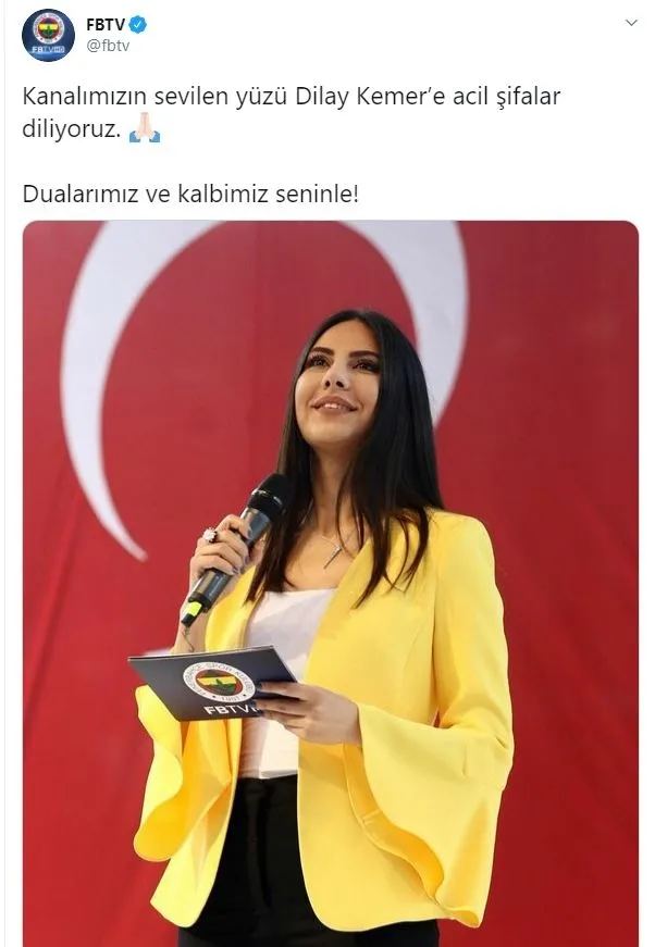 Az önce gelen son dakika haberine göre FB TV'nin başarılı sunucusu Dilay Kemer kanser nedeniyle yoğun bakıma alındı. Dilay Kemer'in yoğun bakımda olduğunu FB TV, Twitter'dan paylaştı. Hastalığı nedeniyle bir süredir çalışamayan Dilay Kemer'in yoğun bakıma alınması sonrası sosyal medyadan destek mesajları geldi. Geçtiğimiz günlerde sosyal medya hesabından bir açıklama yayınlanayan Kemer, ikinci kez kansere yakalandığını belirtmişti.