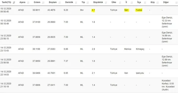 Boğaziçi Üniversitesi Kandilli Rasathanesi ve Afet ve Acil Durum Yönetimi Başkanlığı (AFAD)'ın sürekli olarak güncellediği ve kamuoyuna duyurdu son depremler listesine göre Van - Tuşba'da saat 00.58'da 4.7 şiddetinde bir son dakika depremi meydana geldi. Yerin 9.20 kilometre derinliğinde meydana gelen deprem Iğdır, Hakkari ve Ağrı illerimizde de hissedildi. Sarsıntıların ardından çevre il ve ilçelerde yaşayan vatandaşlar da panik yaşadı.