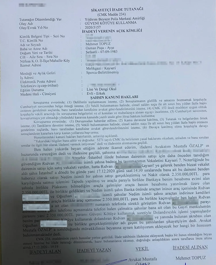 Bunun üzerine avukatımla birlikte Melikgazi İlçesindeki Yıldırım Beyazıt Polis Merkezi'ne giderek Rıdvan A ve kuzeni Oğuzhan A, hakkında şikayetçi oldum. Bu kişiler beni, güvenimi kötüye kullanarak dolandırdı. Her ikisinden de şikayetçiyim. Polis şuanda her ikisini de her yerde arıyor" diye konuştu.