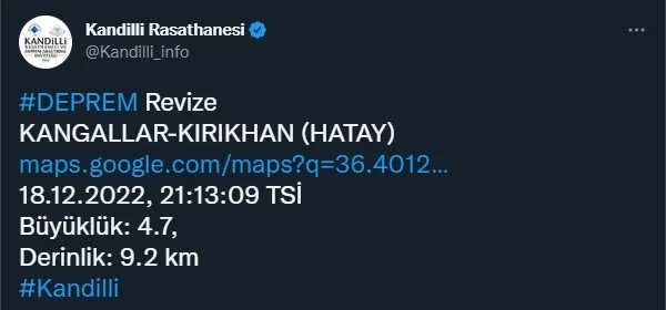 Boğaziçi Üniversitesi Kandilli Rasathanesi ve Afet ve Acil Durum Yönetimi Başkanlığı (AFAD)'ın sürekli olarak güncellediği ve kamuoyuna duyurdu son depremler listesine göre Hatay Kırıkhan'da saat 21:13'te 4.8 şiddetinde bir son dakika depremi meydana geldi. Yerin 11.67 kilometre derinliğinde meydana gelen deprem merkez üssüne yakın illerimizde de hissedildi. Sarsıntıların ardından çevre il ve ilçelerde bulunan vatandaşlar da panik yaşadı.