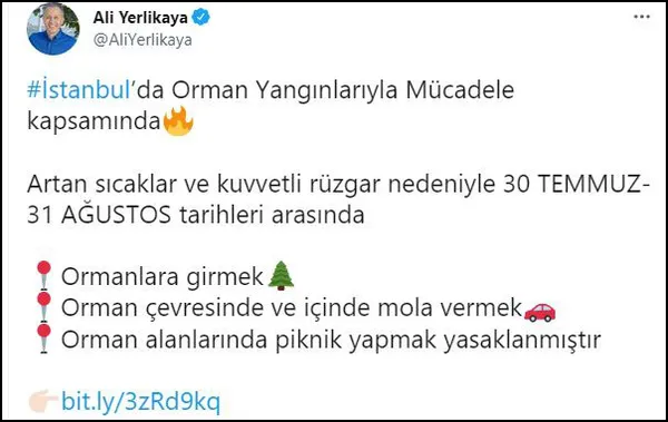 -İstanbul İli Orman Yangınlarıyla Mücadele kapsamında İstanbul İli sınırları içerisindeki ormanlık alanlara girişler, 30.07.2021 – 31.08.2021 tarihleri arasında, 6831 sayılı Orman Kanunu'nun 74. maddesi ve 5442 sayılı İl İdaresi Kanunu'nun 9. ve 66. maddeleri uyarınca yasaklanmıştır.
