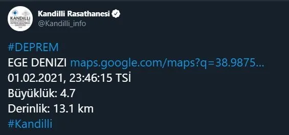 Boğaziçi Üniversitesi Kandilli Rasathanesi resmi Twitter hesabından yaptığı açıklamaya göre Ege Denizi Karaburun açıklarında yerin 13.1 kilometre derinliğinde meydana gelen depremin 4.7 şiddetinde olduğu belirtildi.