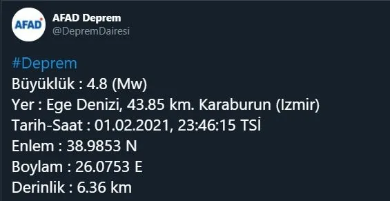 Boğaziçi Üniversitesi Kandilli Rasathanesi ve Afet ve Acil Durum Yönetimi Başkanlığı (AFAD)'ın sürekli olarak güncellediği ve kamuoyuna duyurdu son depremler listesine göre İzmir Karaburun açıklarında saat 23.46'da 4.8 şiddetinde bir son dakika depremi meydana geldi. Yerin 6.36 kilometre derinliğinde meydana gelen deprem Manisa ve Balıkesir illerimizde de hissedildi. Sarsıntıların ardından çevre il ve ilçelerde yaşayan vatandaşlar da panik yaşadı.