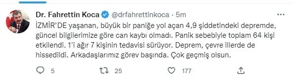 Sağlık Bakanı Fahrettin Koca İzmir depreminde son durumu paylaştı. Sosyal medya hesabından açıklama yapan Bakan Koca şu ifadeleri kullandı: İzmir'de yaşanan, büyük bir paniğe yol açan 4,9 şiddetindeki depremde, güncel bilgilerimize göre can kaybı olmadı. Panik sebebiyle toplam 64 kişi etkilendi. 1'i ağır 7 kişinin tedavisi sürüyor.