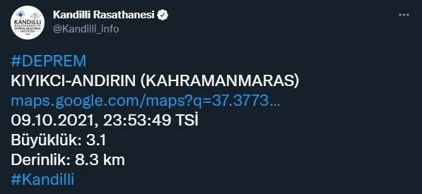 Boğaziçi Üniversitesi Kandilli Rasathanesi ve Afet ve Acil Durum Yönetimi Başkanlığı (AFAD)'ın sürekli olarak güncellediği ve kamuoyuna duyurdu son depremler listesine göre Kahramanmaraş Andırın'da saat 23:53'de 3.1 şiddetinde bir son dakika depremi meydana geldi. Yerin 8.3 kilometre derinliğinde meydana gelen deprem ülkemizde çevre illerde de hissedildi. Sarsıntıların ardından çevre il ve ilçelerde yaşayan vatandaşlar da panik yaşadı.