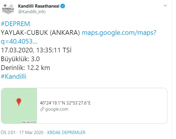 Son dakika haberine göre Kandilli'den alınan verilerle Ankara'nın Çubuk ilinde bir deprem meydana geldi. Kandilli Rasathanesi tarafından depremin şiddeti 3.0 olarak duyuruldu. 17 Mart tarihinde saat 13.35'te meydana gelen depremin büyüklüğü AFAD tarafından 2.6 olarak kayıtlara geçti. Türkiye'nin başkenti Ankara'da yaşanan kısa süreli deprem paniğe sebep olsa da can ve mal kaybı yaşanmadı. İşte 17 Mart 2020 Pazartesi Kandilli ve AFAD son depremler listesi!