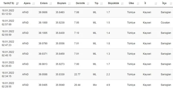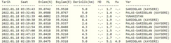 KANDİLLİ RASATHANESİ SON DEPREMLER LİSTESİ