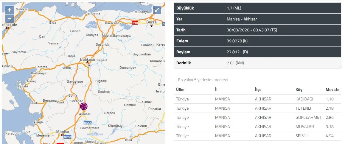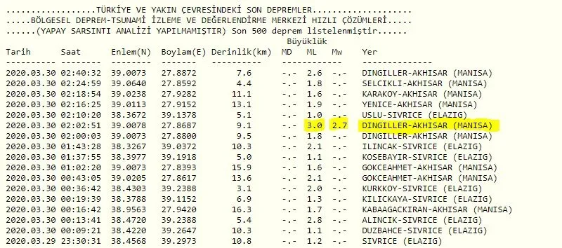 Boğaziçi Üniversitesi Kandilli Rasathanesi ile Afet ve Acil Durum Yönetimi Başkanlığı (AFAD)'ın sürekli olarak güncellediği ve kamuoyuna duyurduğu son depremler listesine göre Manisa Akhisar'da saat 02.02 'de 3.0 şiddetinde bir son dakika depremi meydana geldi. Sarsıntılar Balıkesir, İzmir ve Aydın'da da hissedilirken yerin 9.1 kilometre derinliğinde meydana gelen depremin ardından çevre il ve ilçelerde yaşayan vatandaşlar da panik yaşadı. İşte son dakika haberinin tüm ayrıntıları...