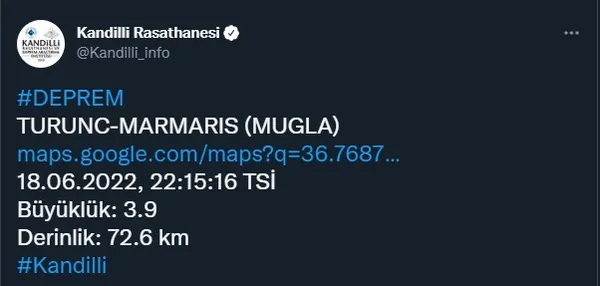 Boğaziçi Üniversitesi Kandilli Rasathanesi ve Afet ve Acil Durum Yönetimi Başkanlığı (AFAD)'ın sürekli olarak güncellediği ve kamuoyuna duyurdu son depremler listesine göre Akdeniz Muğla Marmaris açıklarında saat 22:15'de 3.9 şiddetinde bir son dakika depremi meydana geldi. Yerin 7.0 kilometre derinliğinde meydana gelen deprem merkez üssüne yakın illerimizde de hissedildi. Sarsıntıların ardından çevre il ve ilçelerde bulunan vatandaşlar da panik yaşadı.