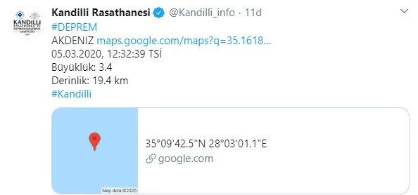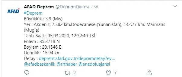 Son dakika haberine göre Muğla'da bir deprem meydana geldi! Depremin şiddetinin 3.9 olduğu ifade edilirken derinliğinin de 15.94 km olduğu ifade edildi. Boğaziçi Üniversitesi Kandilli Rasathanesi tarafından da açıklanan depremin şiddeti 3.4 olarak açıklandı. Kandilli de depremin derinliğini 3.4 km olarak açıkladı.