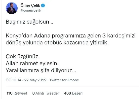 AK Parti Sözcüsü Ömer Çelik kazayla ilgili "Başımız sağolsun… Konya'dan Adana programımıza gelen 3 kardeşimizi dönüş yolunda otobüs kazasında yitirdik. Çok üzgünüz. Allah rahmet eylesin. Yaralılarımıza şifa diliyoruz…" paylaşımında bulundu.