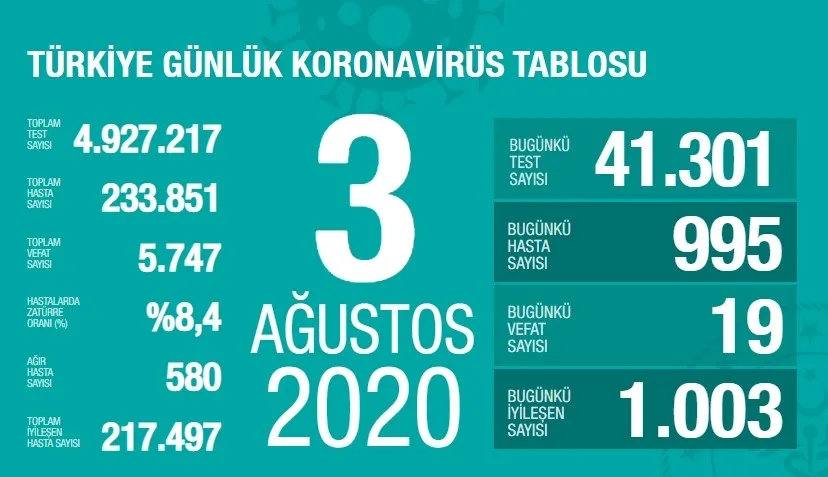 Son dakika haberler… Ülkemizde salgına ilişkin verilerin yer aldığı günlük korona tablosu her gün Sağlık Bakanı Koca tarafından açıklanırken Türkiye corona virüsü vaka, ölü ve iyileşen sayısı ile ilgili tüm veriler kamuoyuna duyurulmuş oluyor. Bu noktada geçtiğimiz günün tablosuna göre; 40 bin 987 vatandaşımıza Covid-19 testi yapılmıştı. Bugünün rakamları ise vatandaşlar tarafından yakından takip ediliyor. Peki, 3 Ağustos Bugün Türkiye corona virüsü vaka, ölü ve iyileşen sayısı kaç oldu? İşte Türkiye corona virüsü vaka sayısı son dakika gelişmeleri…