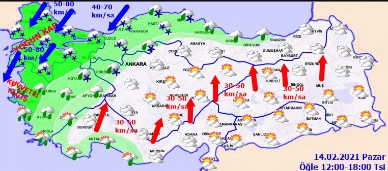 KUVVETLİ RÜZGAR UYARISI; Rüzgarın; Göller Yöresi, İç Anadolu'nun güney ve doğusu ile Doğu Anadolu'nun kuzeyinde güney yönlerden kuvvetli (30-50 km/sa), Marmara, Kuzey Ege ile Batı Karadeniz'in batı kıyılarında kuzeydoğu yönlerden yer yer fırtına (40-80 km/sa) şeklinde esmesi beklendiğinden meydana gelebilecek olumsuzluklara karşı dikkatli ve tedbirli olunması gerekmektedir.