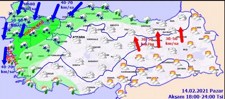 Meteoroloji Genel Müdürlüğü tarafından yapılan son değerlendirmelere göre; Ülkemiz genelinin parçalı ve çok bulutlu, Kıyı Ege, Orta ve Doğu Karadeniz kıyıları ile Antalya çevrelerinin yağmur ve sağanak yağışlı, Marmara, İç Ege, Batı Karadeniz ile Eskişehir, Çankırı, Erzurum ve Ardahan çevrelerinin karla karışık yağmur ve kar yağışlı geçeceği tahmin ediliyor. Yağışların; Marmara ve Batı Karadeniz'de yoğun kar, İzmir ve Manisa çevrelerinde kuvvetli yağmur ve sağanak şeklinde olması bekleniyor. Doğu kesimlerde buzlanma ve don olayı bekleniyor. Doğu Karadeniz'in iç kesimleri ile Doğu Anadolu'nun güneydoğusunda çığ oluşma tehlikesi bulunmaktadır.