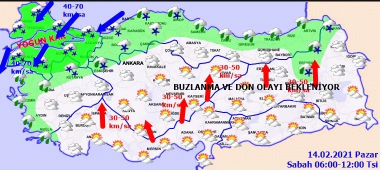 YOĞUN KAR YAĞIŞI UYARISI: Yağışların; Marmara ile Batı Karadeniz'de yoğun kar (kıyılarda 5 ila 15 cm, iç kesimlerde 15-20, yüksek kesimlerde 20-30 cm) şeklinde olacağı tahmin edildiğinden kar yağışının meydana getireceği buzlanma ve don olayı ile ulaşımda aksamalar gibi olumsuzluklara karşı dikkatli ve tedbirli olunmalıdır.