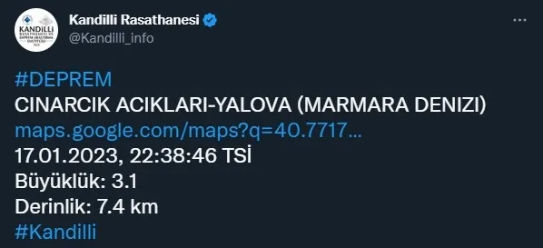 Boğaziçi Üniversitesi Kandilli Rasathanesi ve Afet ve Acil Durum Yönetimi Başkanlığı (AFAD)'ın sürekli olarak güncellediği ve kamuoyuna duyurdu son depremler listesine göre Yalova Çınarcık açıklarında saat 22:38'de 3.1 şiddetinde bir son dakika depremi meydana geldi. Yerin 7.4 kilometre derinliğinde meydana gelen deprem merkez üssüne yakın illerimizde de hissedildi. Sarsıntıların ardından çevre il ve ilçelerde yaşayan vatandaşlar da panik yaşadı.