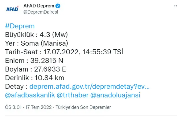 Az önce gelen son dakika haberine göre Manisa'da deprem oldu. Boğaziçi Üniversitesi Kandilli Rasathanesi ile Afet ve Acil Durum Yönetimi Başkanlığı (AFAD) tarafından yayınlanan son depremler listesi verilerine göre ise Manisa depremin şiddeti 4.3 belirlendi. Yaşanan artçı depremler deprem mi oldu, nerede ve kaç şiddetinde sorusuna yanıt arattırıyor. İşte 17 Temmuz 2022 AFAD ve Kandilli Rasathanesi son depremler listesi