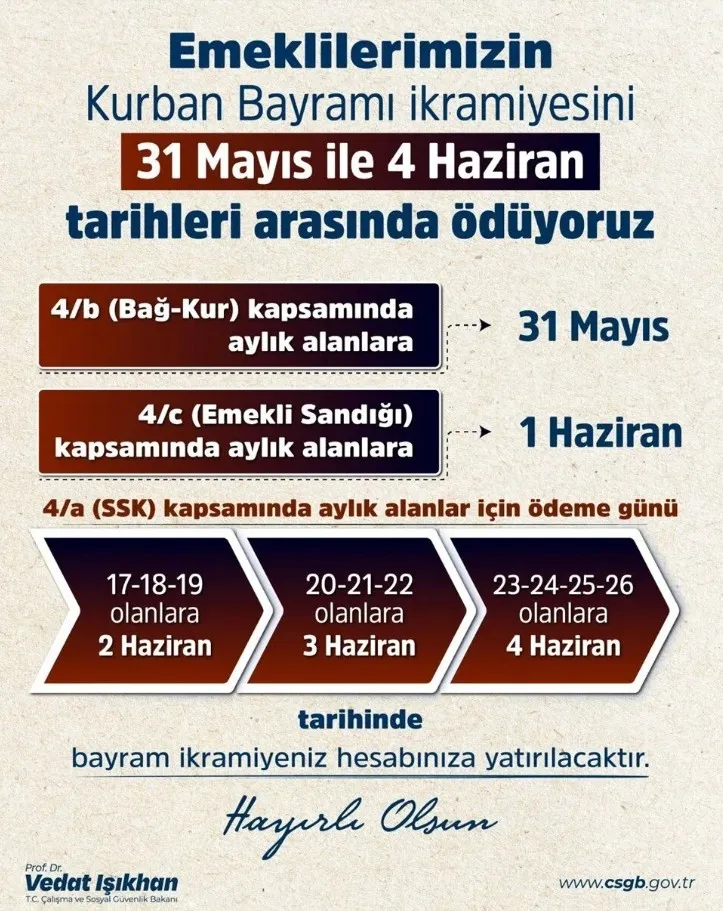 Işıkhan açıklamasında, "Emekli vatandaşlarımızın bayram ikramiyesi ödemeleri Kurban Bayramı öncesinde 31 Mayıs ile 4 Haziran tarihleri arasında banka hesaplarına yatırılacak.